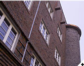 Ähnlich wie an Fischers RVR-Gebäude in Essen beschränken sich die Flächen mit schichtweise vorgezogenen Klinkern auf das Erdgeschoss, darüber sind die mehrfach hintereinander gesetzten Rundungen mit einer glatten Backsteinhaut überzogen. Ein interessantes Element sind die vertikalen Schlitzfenster am Trockenboden im obersten Stockwerk. Im Innenhof des Blocks befindet sich ein alter Hochbunker.